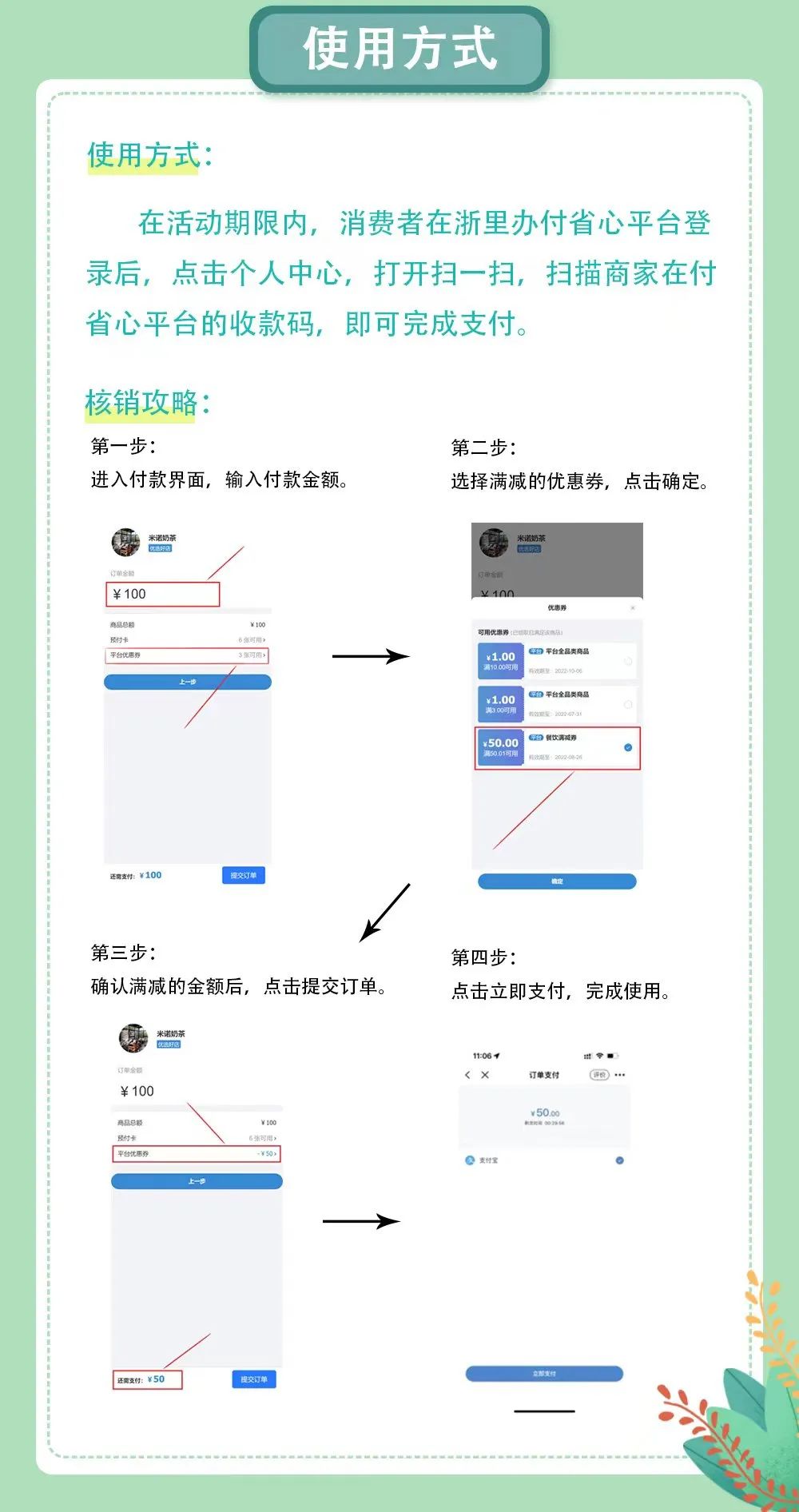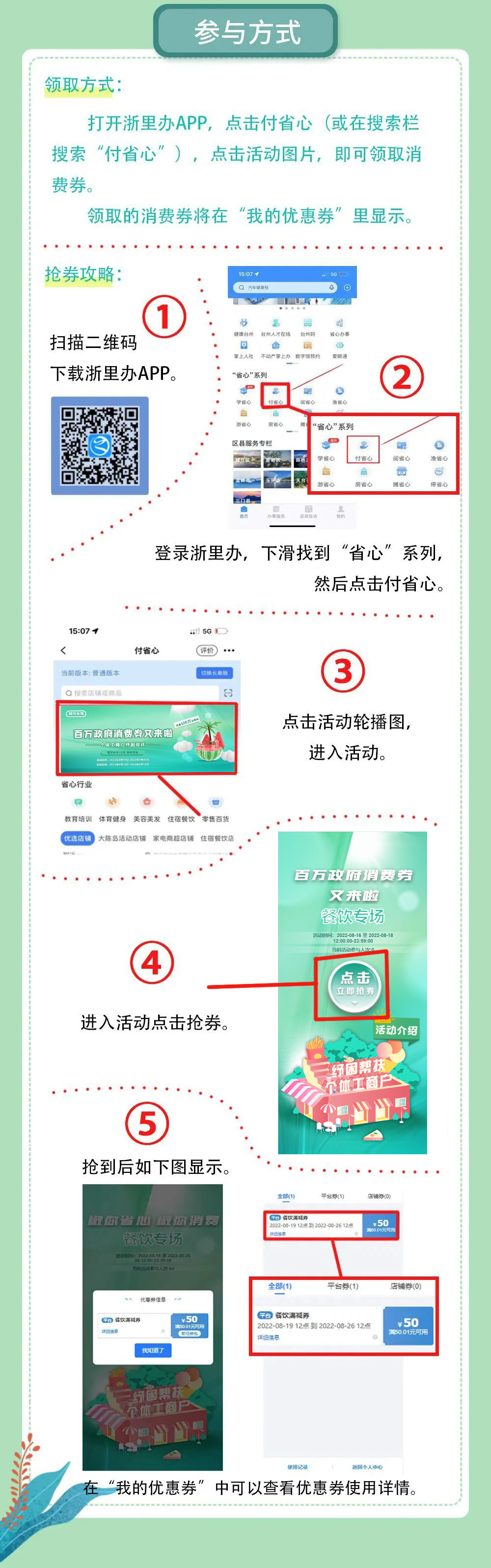 本次活动以电子消费券形式发放,并在浙里办付省心平台里领取。消费券为50元面值,每人限领取一张,可在活动参与的经营户中消费时,抵扣等额面值的消费额。消费券领取后请在规定期限内使用,过期未使用的消费券将自动作废。