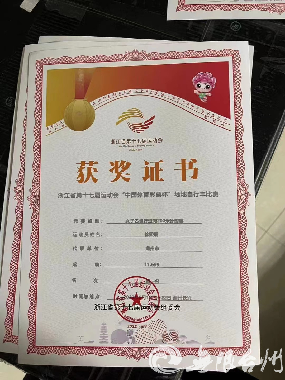 9月19日 温岭籍小将徐熙媛勇夺 省运会场地自行车 乙组行进间200米计时赛冠军 这也是本届省运会场地自行车比赛的 首枚金牌! 9月19日,浙江省第十七届运动会“中国体育彩票杯”场地自行车比赛在湖州市长兴县开赛,温岭籍小将徐熙媛以11.699秒的优异成绩勇夺女子乙组行进间200米计时赛冠军,这也是本届省运会场地自行车比赛产生的首枚金牌。此外,徐熙媛当天还以35.719秒的优异成绩拿下了女子乙组500米计时赛亚军。