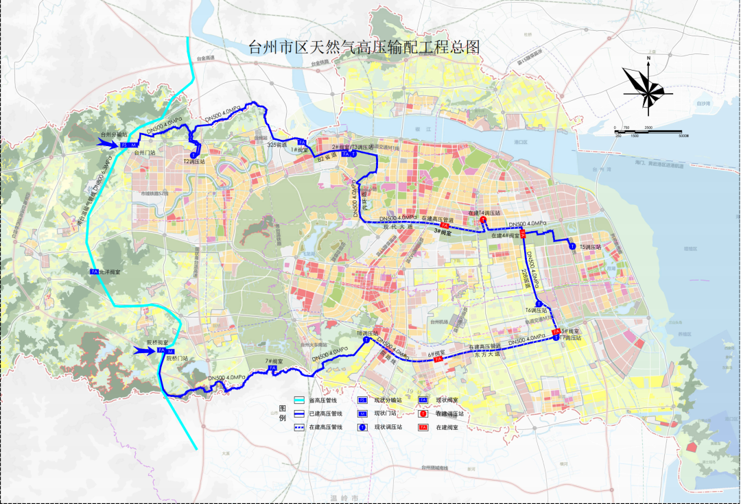 该工程是省、市重点工程,也是重要的基础设施工程和民生工程。工程位于台州市区范围内,共建设天然气高压输配管道105公里,主干线管径DN500,总用地约148亩,沿线设置1座调控中心、2座门站、9座调压站、7座阀室和1座抢修中心,工程承接甬台温长输管线,向椒黄路三区和台州湾新区供气。