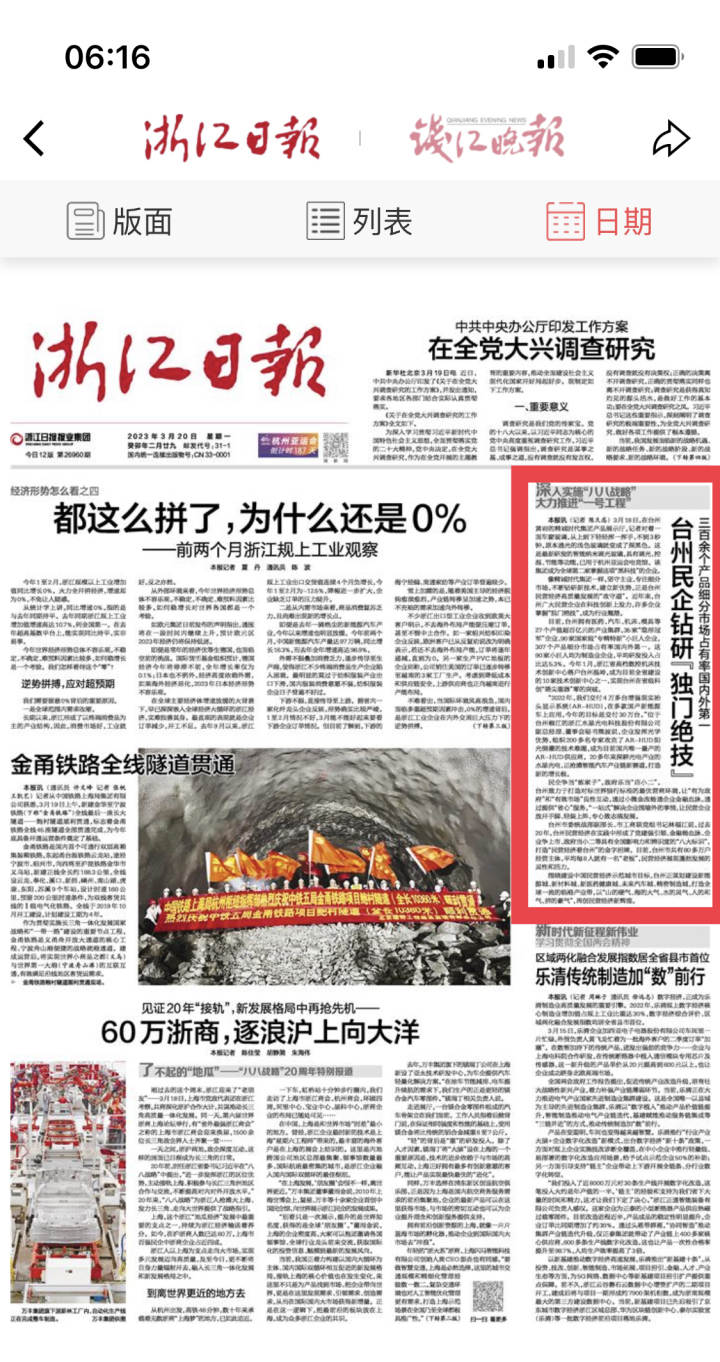 今天(3月20日) 浙江日报头版刊登 《三百余个产品细分市场占有率国内外第一 台州民企钻研“独门绝技”》一文 点赞台州民企坚守主业、专注细分市场 在科技创新上发力 成为行业翘楚 全文如下