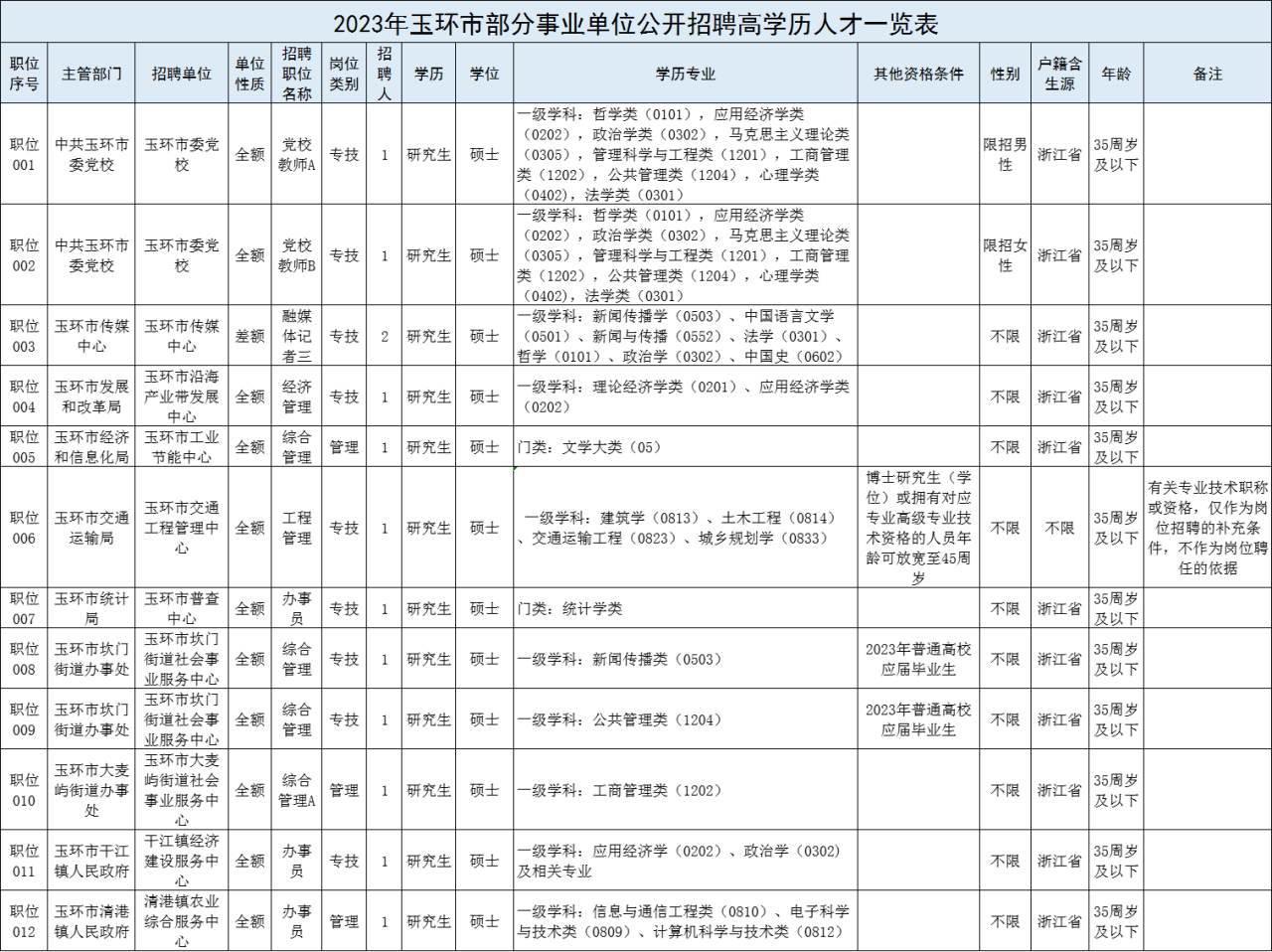 玉环市事业单位公开招聘高学历人才公告详情查询网站: