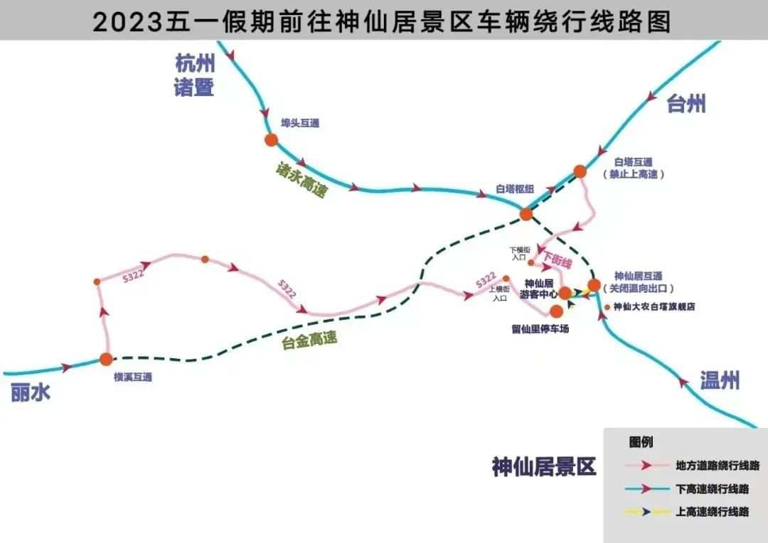 2023年4月29日(周六)至5月3日(周三),每天8时至12时的大流量时段,S26诸永高速神仙居收费站温州方向出口关闭。S28台金高速白塔收费站进口关闭(只出不进),在该时段前往神仙居景区及过境的车辆从台金高速白塔或其他相邻收费站驶离高速,通过S322省道前往神仙居景区,游玩结束后从诸永高速神仙居收费站进入高速。