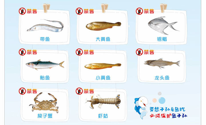 8种冰鲜或活体水产品禁售 5月8日后,全市水产交易市场、农贸市场、超市、临时摊点等各类市场和饭店、大排档等餐饮场所禁止销售带鱼、大黄鱼、小黄鱼、银鲳、鲐鱼、三疣梭子蟹、龙头鱼、虾蛄等8种海洋捕捞冰鲜或者活体水产品。