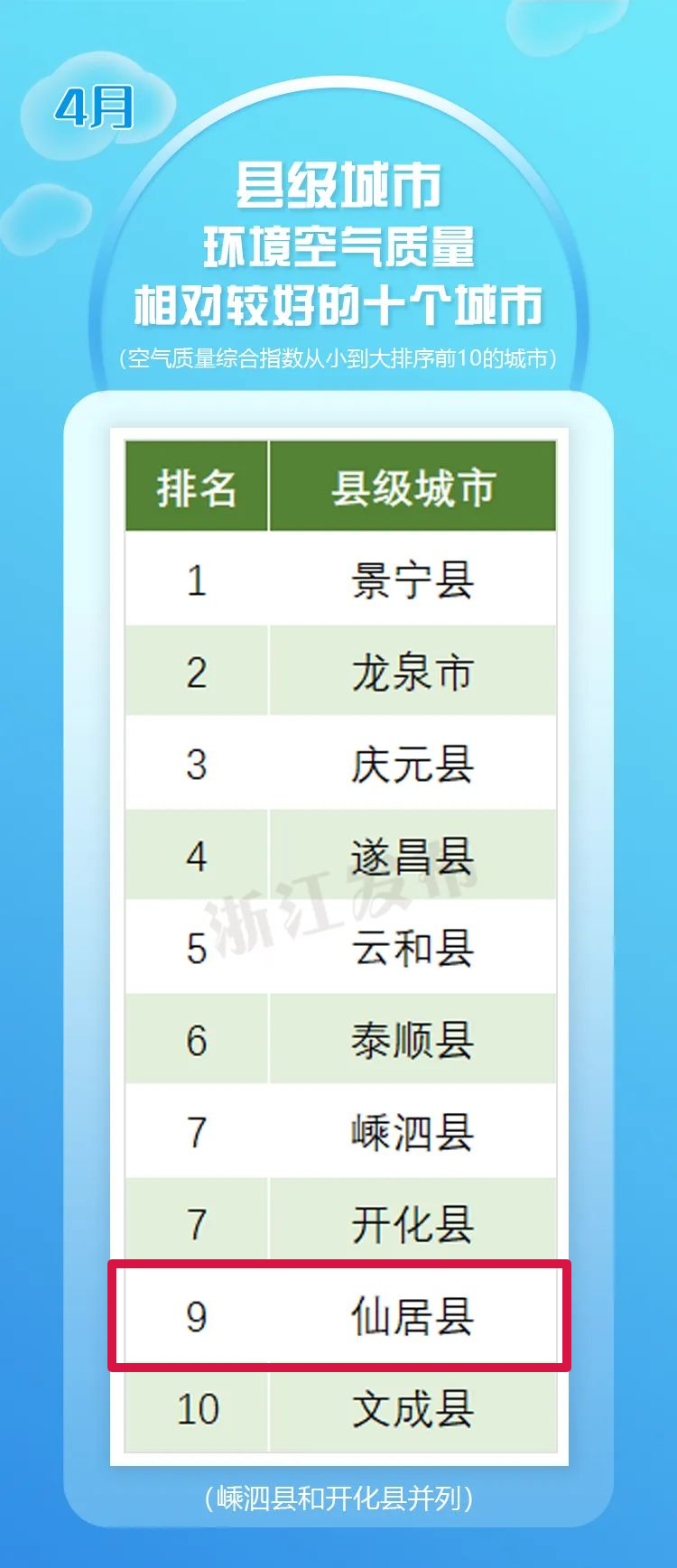 县级城市环境空气质量相对较好的十个城市,仙居县排名第九位。