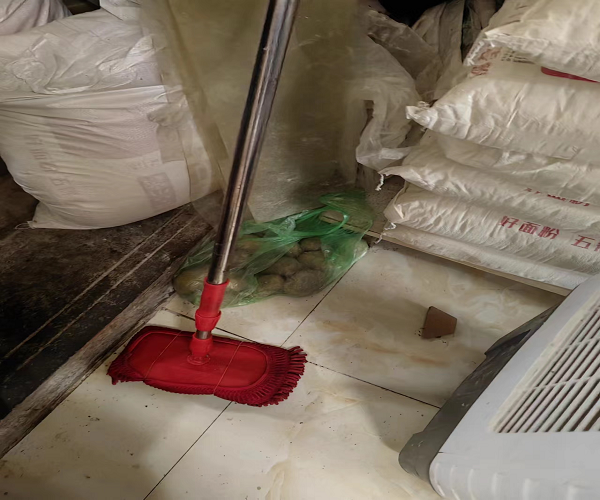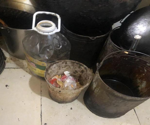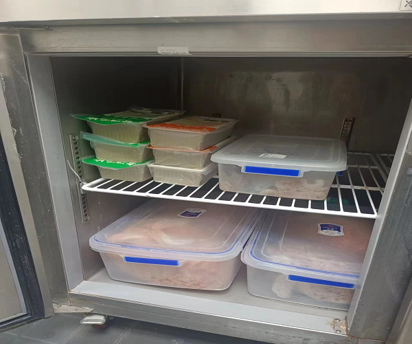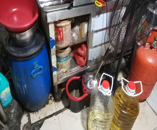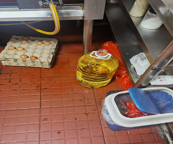2.食材未离地离墙存放,食用油使用后未及时加盖;