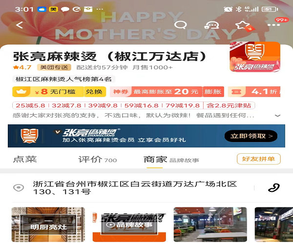 店铺招牌:张亮麻辣烫(椒江万达店)