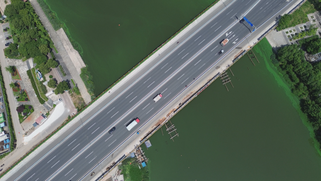 本次改造实施两侧加宽,加宽后标准段宽度为50.95米,双向9车道,分别为西幅4车道,东幅5车道。桥梁上部结构中间两跨为钢箱梁50.16米,其他采用预应力空心板梁。