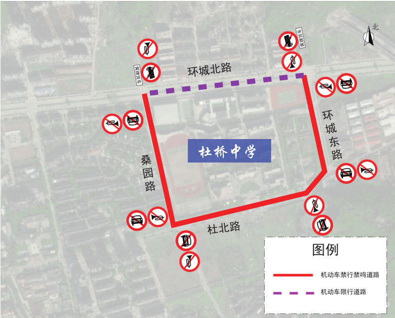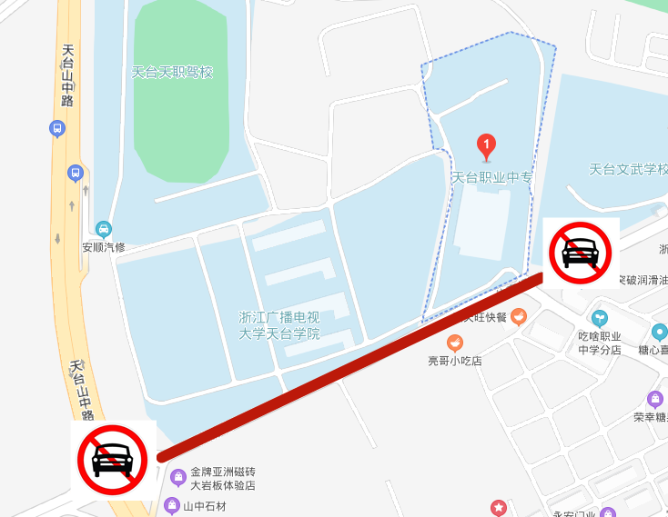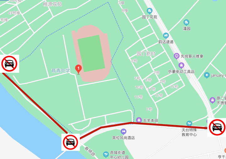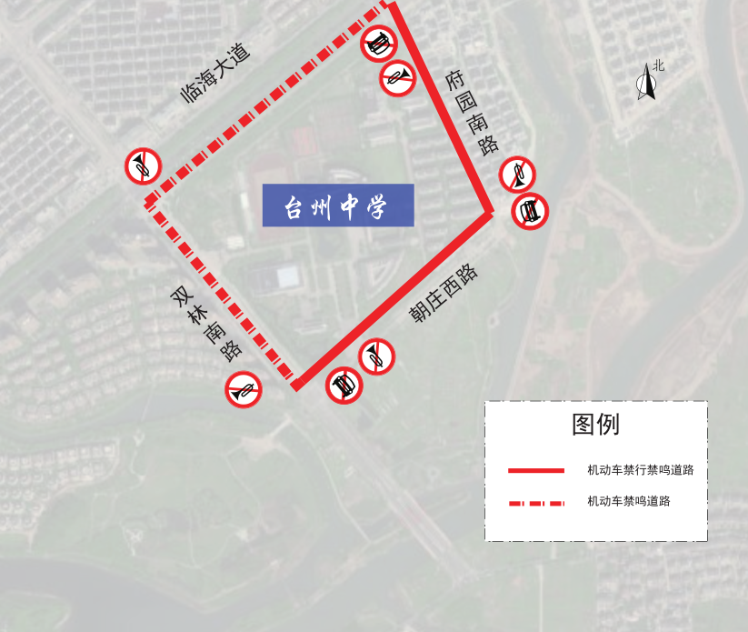 管制路段:府园南路台州中学东边围墙外路段和朝庄西路台州中学南围墙外路段禁行、禁鸣;双林南路(临海大道至朝庄西路路段)禁鸣;临海大道(双林南路至府园南路路段)禁鸣。