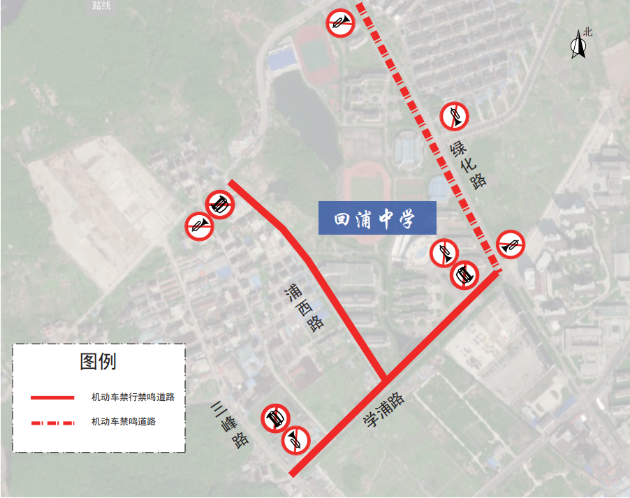 管制路段:学浦路(三峰路至绿化路路段)禁行、禁鸣;浦西路全段禁行、禁鸣;绿化路(学浦路以北路段)禁鸣。