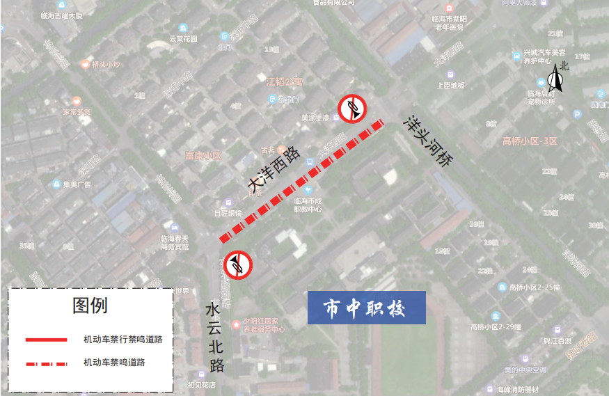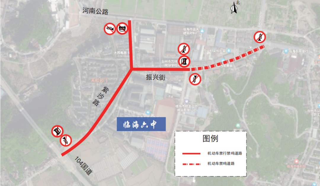 管制路段:紫沙路(104国道至河南公路路段)禁行、禁鸣;振兴街(台州市万祥网球学校门至天和名门小区门口路段)禁行、禁鸣;振兴街(灵江大桥至万祥网球学校门口路段)禁鸣。