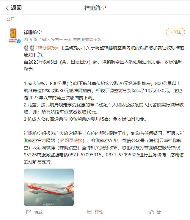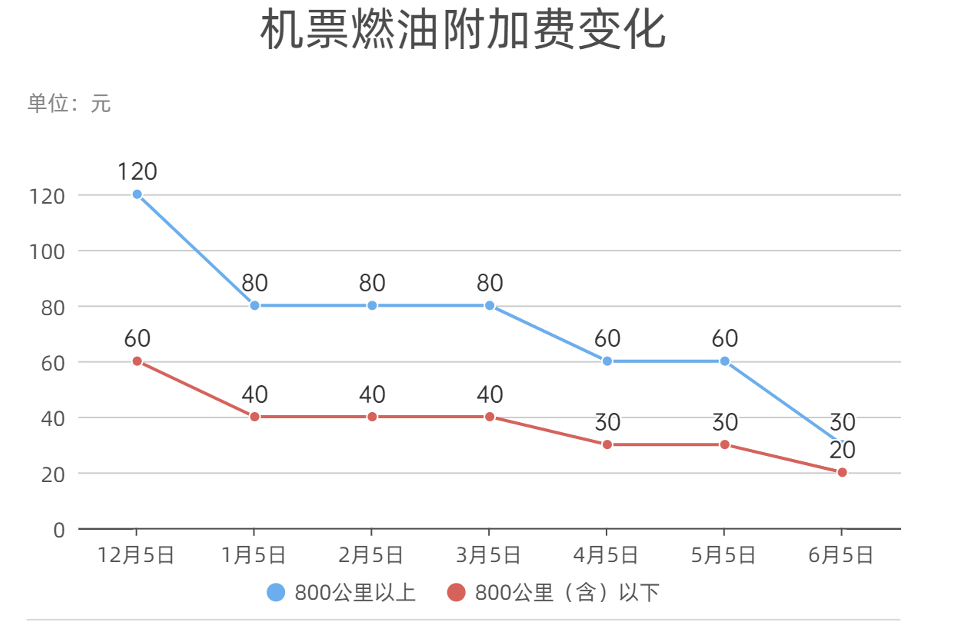 2023年6月5日起,燃油附加费下调为20元和30元。