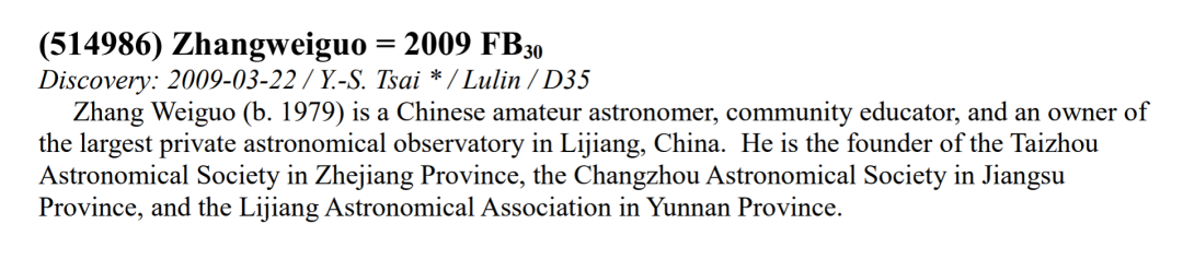 近日,国际天文学联合会(IAU)小天体命名工作组发布了最新一期的《WGSBN Bulletin》,由蔡元生先生发现的永久编号为514986号小行星正式命名为“张卫国星”。