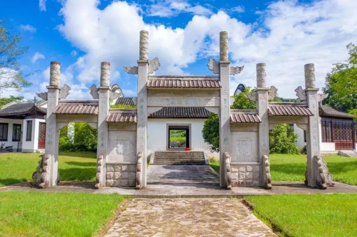 石牌楼 牌楼为三间六柱石坊,横梁上写着“东南道学世家”六个遒劲有力的大字,是南宋状元王十朋书写的。