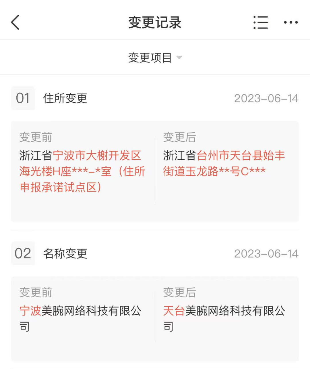 天眼查App显示,近日,宁波美腕网络科技有限公司发生工商变更,企业名称变更为天台美腕网络科技有限公司,同时登记地址由宁波市大榭开发区变更为台州市天台县。