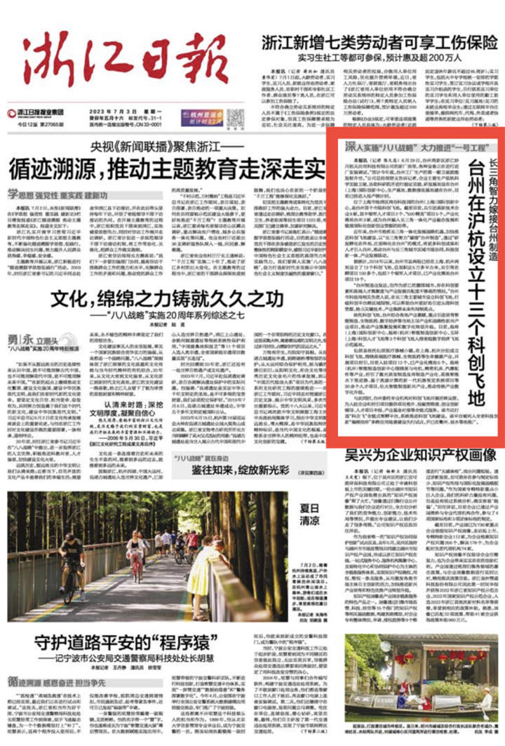 今天(7月3日) 《浙江日报》头版关注台州 长三角智力嫁接台州制造 台州在沪杭设立十三个科创飞地