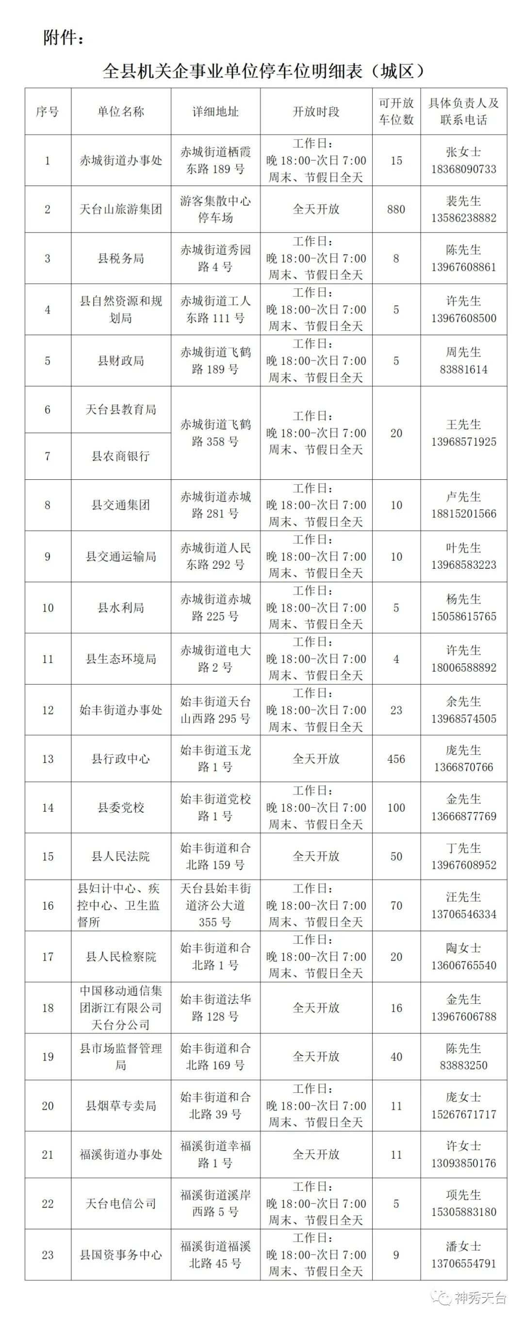 自2023年7月20日起,天台城区范围内23家机关企事业单位内部停车场,共1773个停车位向社会车辆(7座以下小型非营运载客汽车)免费错时开放。按照“先来后到、停满为止”原则。