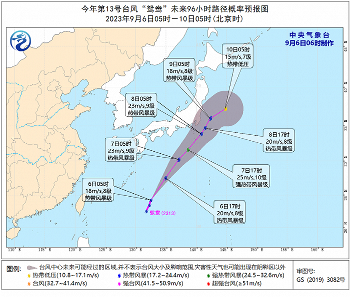 5日晚上11时其中心位于日本鹿儿岛偏南方向约1010公里的洋面上,北纬22.5度、东经131.7度, 8级(18米/秒),1000百帕。