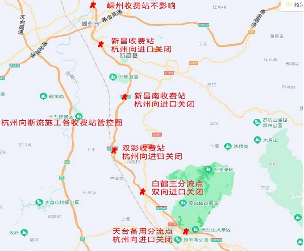 杭州方向断流施工期间,高速公路管理部门将在白鹤互通实施分流,天台互通为备用分流点,白鹤至三界沿线收费站杭州向进口关闭,白鹤收费站双向进口关闭,G1512双向转G1522杭州方向匝道关闭。对往台州方向行车的司机朋友们无影响。