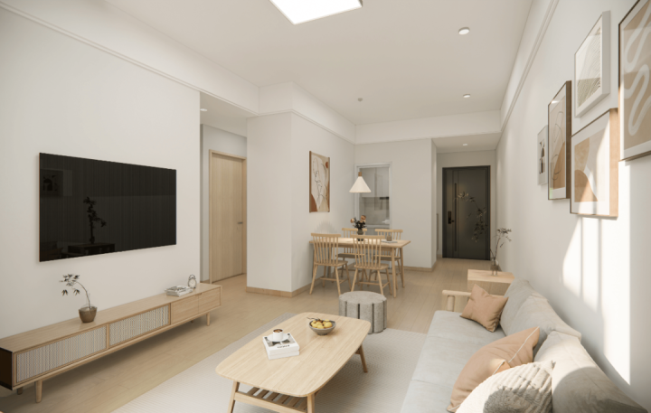 室内效果图 此外,项目采用板式与点式住宅相结合布局的形式,视野开阔、空间大气,且包含三种刚需户型,可以满足不同家庭群体的居住需求。