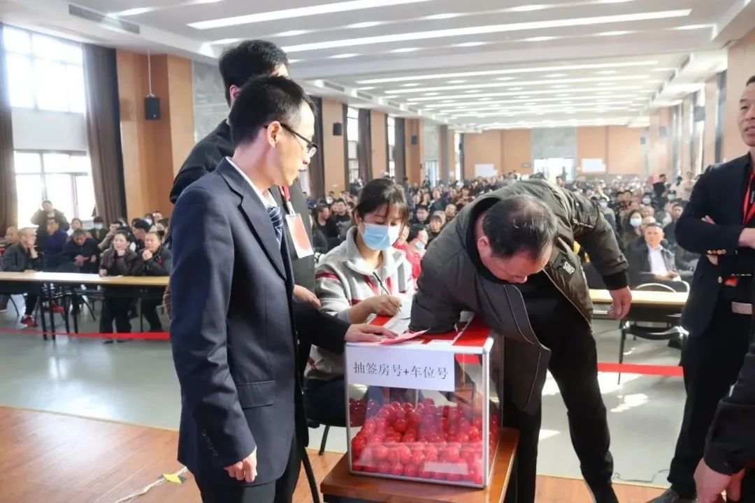 在大家共同监督下,检查票箱、搅拌号码球......第一轮先抽顺序号,第二轮再直接抽取套房+车位号,抽中房子后,户主及时签字确认、按上手印。现场,工作人员耐心引导,大家积极配合,会场秩序井然。