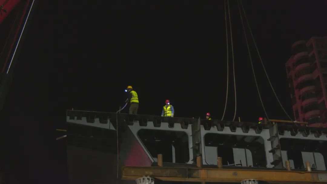 12月21日晚,在内环线8号立交放射线工程跨82省道段,10多名施工人员冒着严寒天气坚守岗位,进行桥体合龙工作。
