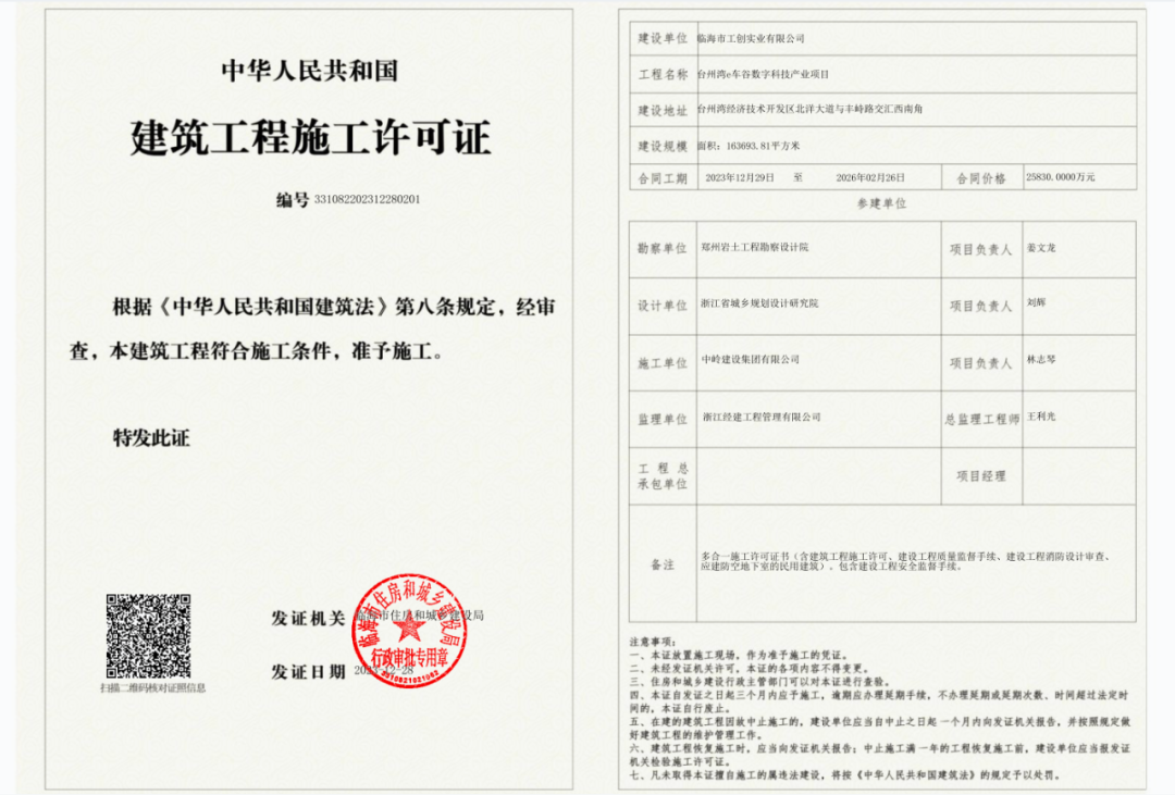 12月28日,临海市工投集团台州湾e车谷数字科技产业项目成功办理建筑工程施工许可证,标志着e车谷项目正式进入施工阶段。