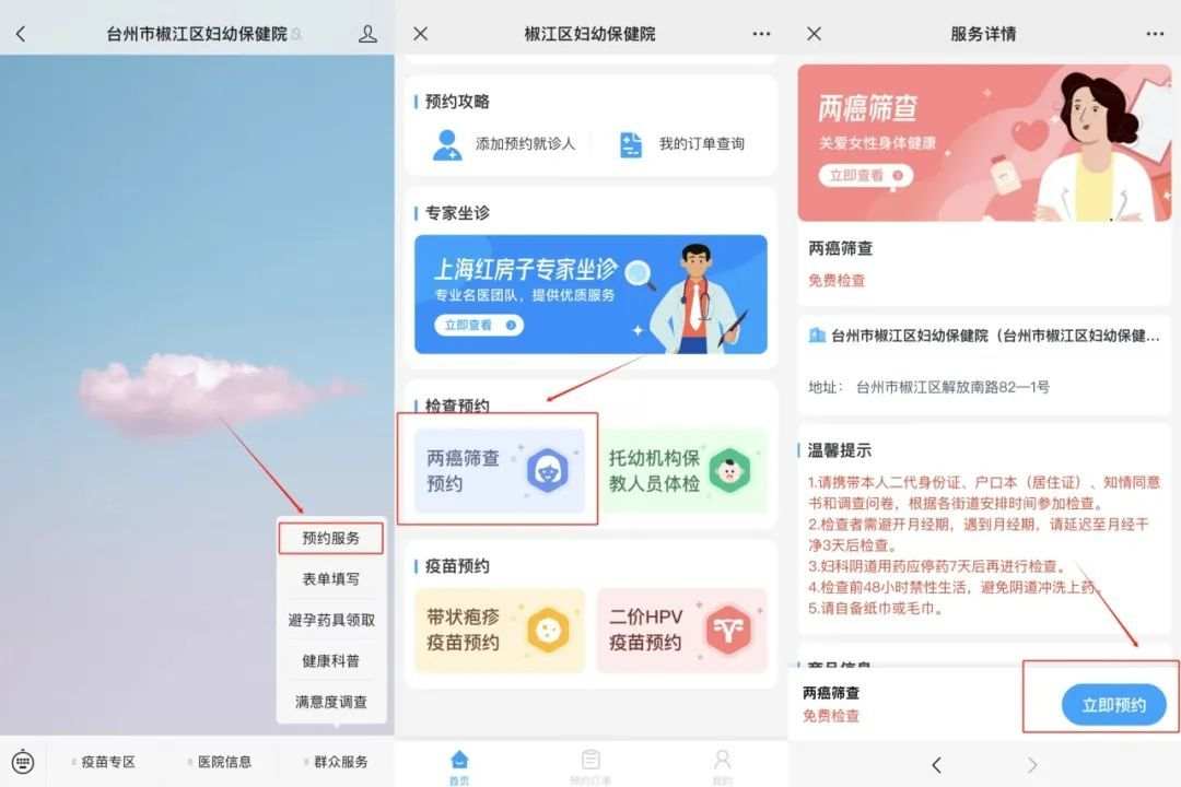 1.关注台州市椒江区妇幼保健院公众号→患者服务→预约服务→选择两癌筛查→添加就诊人基本信息→选择预约时间→点击立即预约。