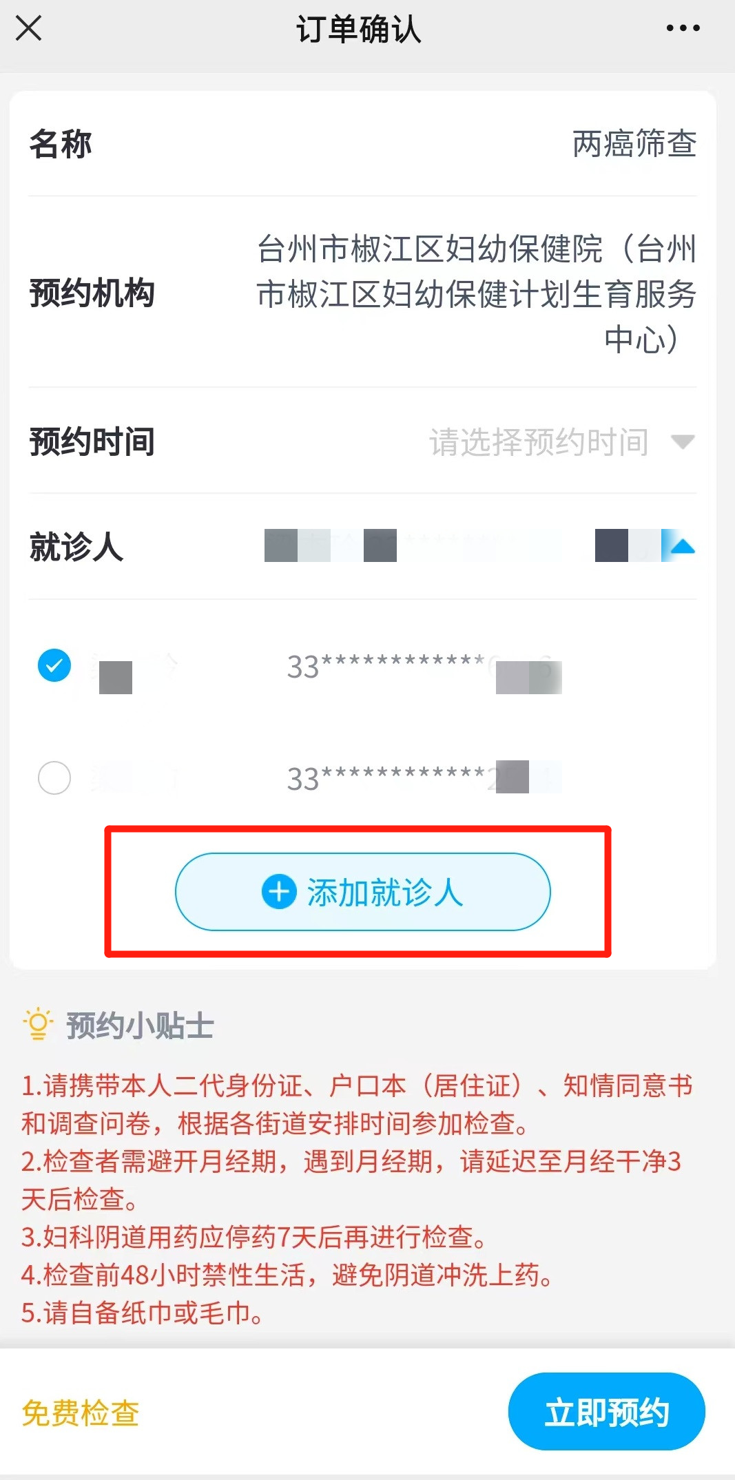 3.他人代为预约流程预约可由他人通过“添加就诊人”代为预约,预约时须准确填写筛查者信息。