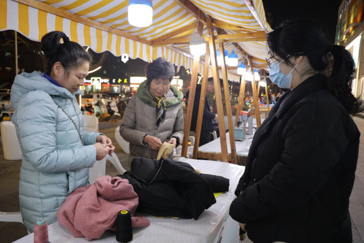 看到有修补衣服的便民摊位,家住锦园小区的江女士赶紧回家拿来两件羊绒衫过来。她说:“这两件羊绒衫蛀了两个洞,本想拿到横湖小学边上修补,可白天一直没时间,现在夜市里有了修补摊,拿过来补一下挺方便。”说话间,在修补摊主郑阿姨的巧手下,几个蛀洞很快就补好了。