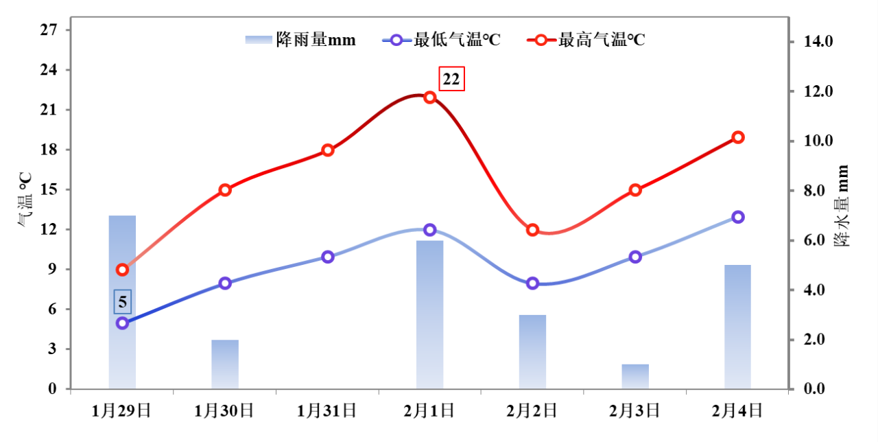 气温:气温在波动中回升。今天早晨最低气温:4~6℃,周四前气温逐渐回升,白天最高温度升至20~22℃;周四夜里到周五受冷空气影响,白天最高气温回落至11~13℃;双休日西南暖湿气流再次发展加强,气温又有小幅回升。