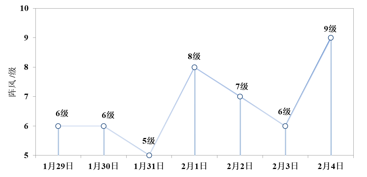 风力:周四傍晚到周五白天、周日沿海海面风力加大,其中周日有8~9级偏南大风。
