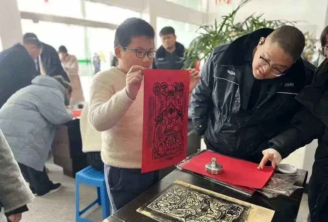 画有年味,年在画中。活动中,拓年画迅速出圈,实力吸粉。大家将蘸墨涂布拓板上,然后铺平纸张、均匀压刷、轻轻揭起,一幅生动形象的年画就完成了。