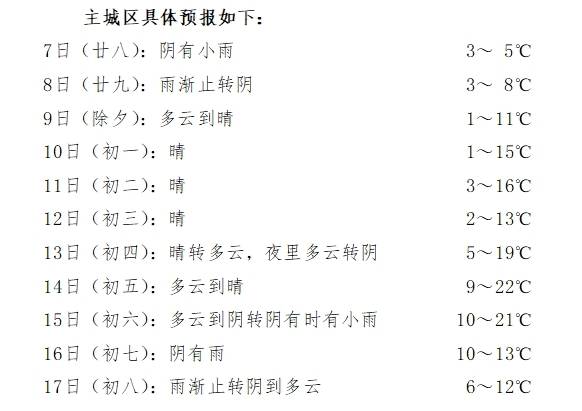 2024年春节假日期间(2月9~17日)晴多雨少,温度先升后降,气象条件总体适宜出行。除夕到初三(9~12日)我市天气连晴,早晚时段体感偏冷,其中除夕、初一(9日、10日)早晨最低气温北部地区0~-2℃有薄冰,其它地区1~3℃有霜。初四~初六前期(13日~15日前期)暖湿气流发展,我市云系逐渐增多,气温大幅回升,预计白天最高气温可达20~22℃。初六后期到初八受冷空气南下影响,将有一次降温、弱降水和沿海海面偏北大风天气。