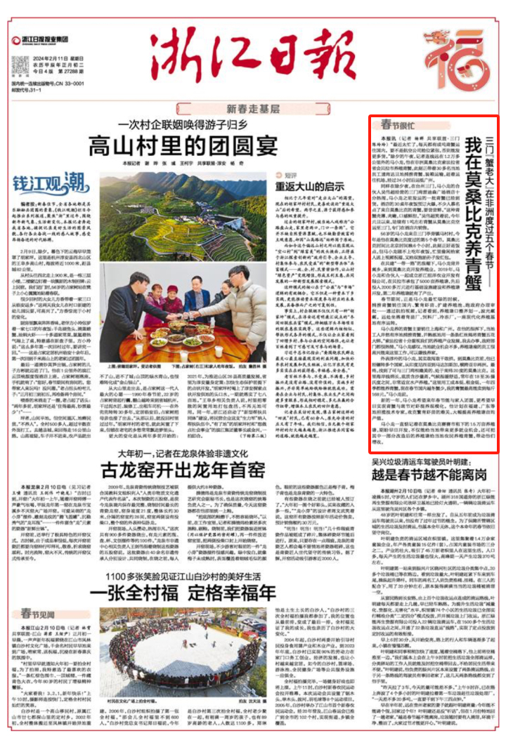 2月11日 《浙江日报》头版报道 《三门“蟹老大”在非洲度过五个春节 ——我在莫桑比克养青蟹》 原文如下↓ “最近太忙了,每天都有成吨青蟹运往国内。要不是航空公司舱位紧张,否则能发更多货。”除夕的午夜,记者连线远在1.2万多公里外的马小龙,他在非洲莫桑比克索法拉省省会贝拉市养殖青蟹,此刻正带着30多名当地员工通宵达旦地捕捞青蟹、装箱运输,赶着运往机场,经过24小时后运抵广州。