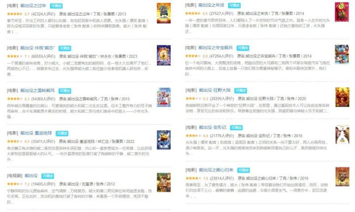 影片质量同样可圈可点。《熊出没》系列电影中,豆瓣评分7—8分的占一半,分数最低的也有6.2,超过及格线。