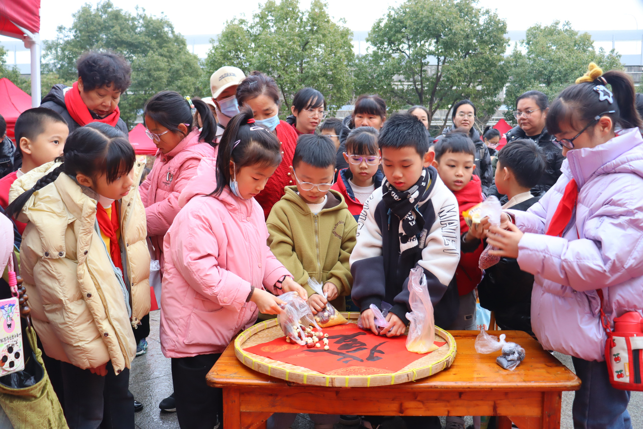 学生们和家长现场玩腊八蹲小游戏。 学生们还饶有兴致地体验了五谷丰登、年年有鱼、牛轧软糖、烧箔日历、柿柿如意、糯糯甜枣等传统民俗项目,感受浓浓的节日氛围。“我用胶水在日历上写了福字,还画了一个铜钱,再把金箔粘上去,撕金箔的过程需要一点耐心,完成之后会有满满的成就感。”学生黄晟暄向大家展示他的体验成果。
