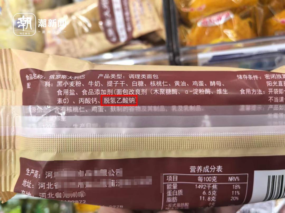 不过在走访中,记者发现仍有个别品牌产品配料表中出现了脱氢乙酸钠的身影。一款俄罗斯大列巴的面包,包装袋显示,该产品的食品添加剂中,仍有脱氢乙酸钠。