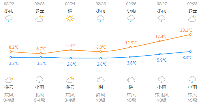 下周开始,冷空气活动减弱,2月26日起气温明显上升,白天最高气温从10℃朝着20℃冲击,28日全省大部地区最高气温将升至20到23℃,暖洋洋的感觉来了。