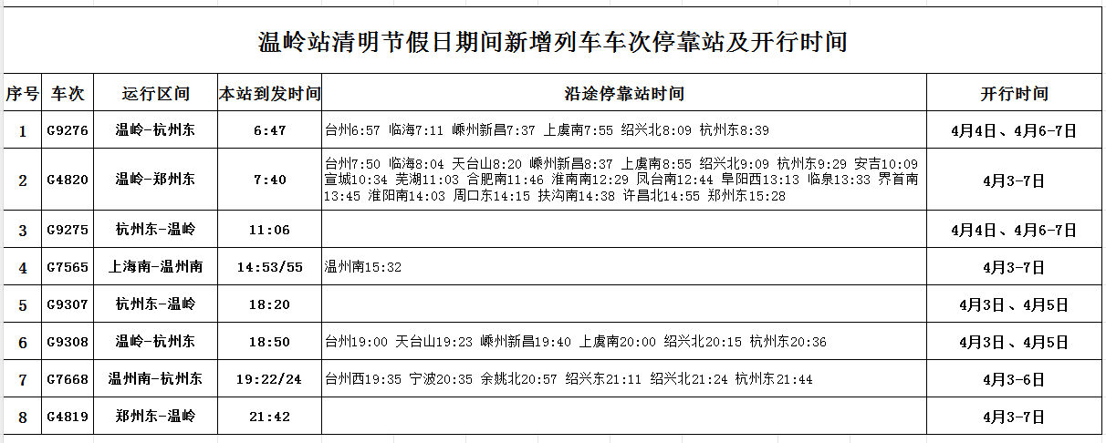 为满足旅客出行需求,该站计划开行临客4对,其中3对为始发终到列车,主要集中在杭州、上海方向。具体车次、运行区间、到发时间、停靠站点及开行时间,见下表。