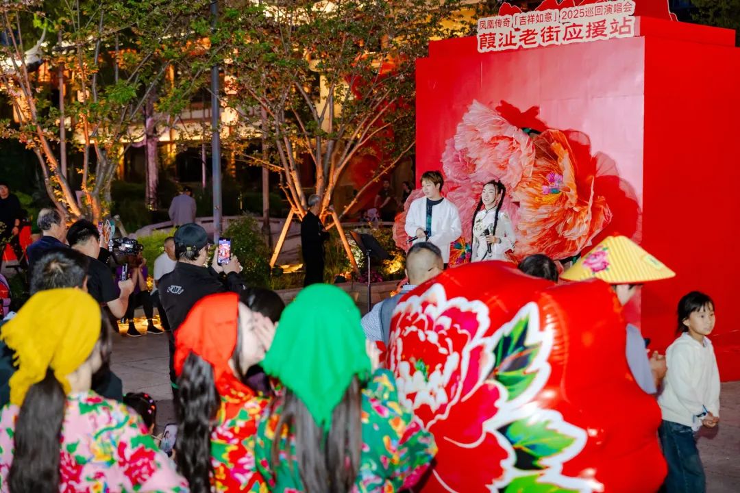 闪现凤凰传奇「吉祥如意」2025巡回演唱会-葭沚老街应援站现场,这里仿佛打翻了调色盘一般喜庆热闹,活脱脱一大型东北大花主题乐园,红配绿的东北大花从街头挂到街尾,和街区内涌动的人潮相辉映,氛围感满分。