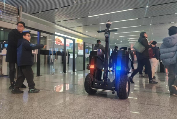 载人无人两用巡逻机器人是一款集成高精度定位、AI分析及自动驾驶的智能装备,采用“无人+载人”双巡防模式,具备环境感知、视音频采集、语音播报、一键求助等功能。台州公安创新构建“前端智能装备与后台智能系统协同联动的应用生态”,设备实时对接台州公安大脑,打造台州“海陆空”立体巡防网络,已在火车站、机场、5A景区等重点区域部署应用,有效提升了台州智慧巡控效能。