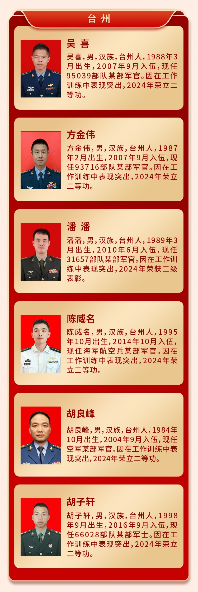 去年以来,广大浙江籍官兵深入学习贯彻习近平新时代中国特色社会主义思想,贯彻落实习近平强军思想,聚焦强军目标,投身强军实践,在打好实现建军一百年奋斗目标攻坚战的新征程上矢志打赢、勇于担当、锐意进取、无私奉献,涌现出一大批有灵魂、有本事、有血性、有品德的先进典型。为弘扬爱国主义主旋律、汇聚强国强军正能量,不断激发广大军人军属政治荣誉感和官兵建功军营的热情,增强人民群众的国防观念和崇军尚武意识,切实营造全社会关心国防、热爱国防、建设国防、保卫国防的浓厚氛围,值此中国人民解放军建军98周年之际,推出“八一光荣榜”,公布2024年4月1日至2025年3月31日期间获得二等功、二级表彰以上的浙江籍官兵。