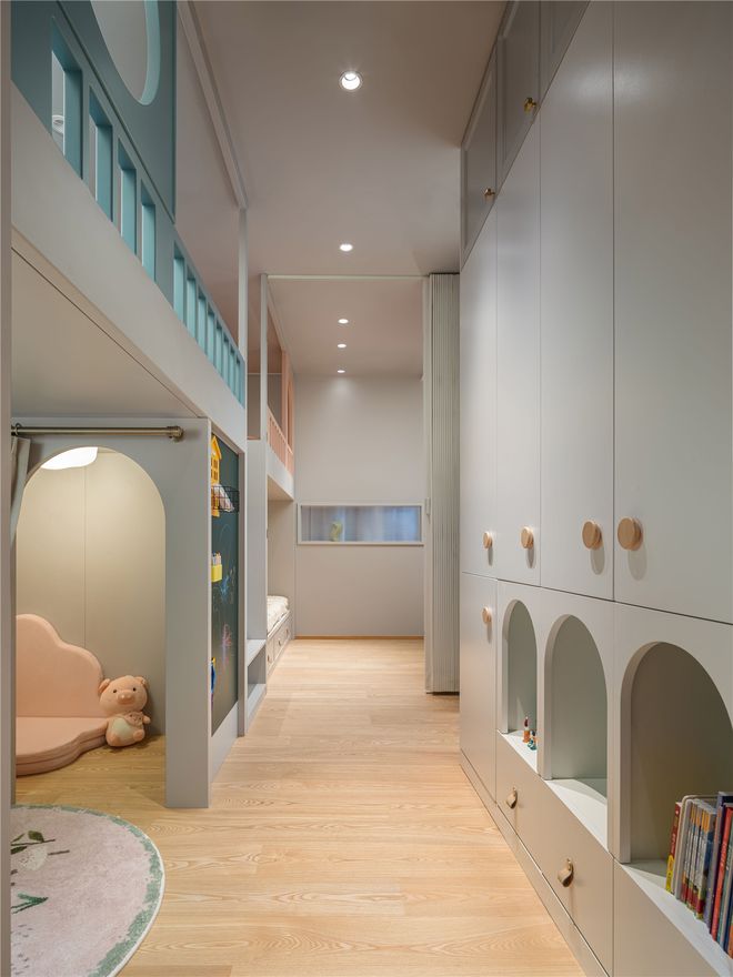 高低床对面就是定制柜,弧形门洞里摆着孩子们喜爱的书籍,想要拿取也很方便;柜门把手也都是圆形和皮革把手,能够更好的避免孩子们被磕碰到。