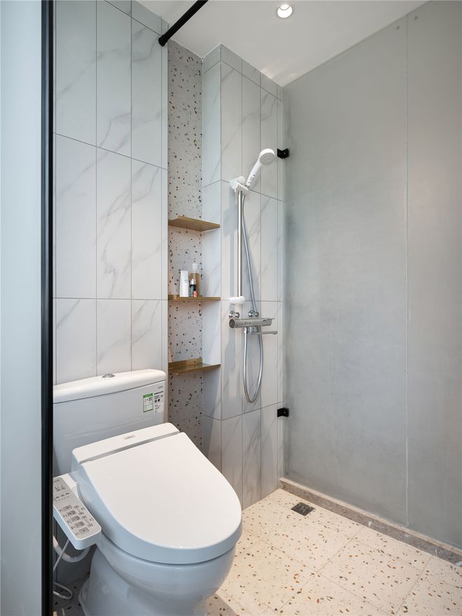 淋浴房内也沿用了厨房的水磨石花砖,开放式的隔板设计也比较方便沐浴时拿取一些洗浴用品。