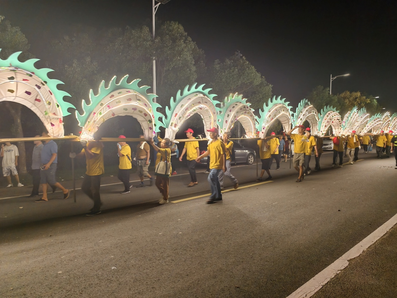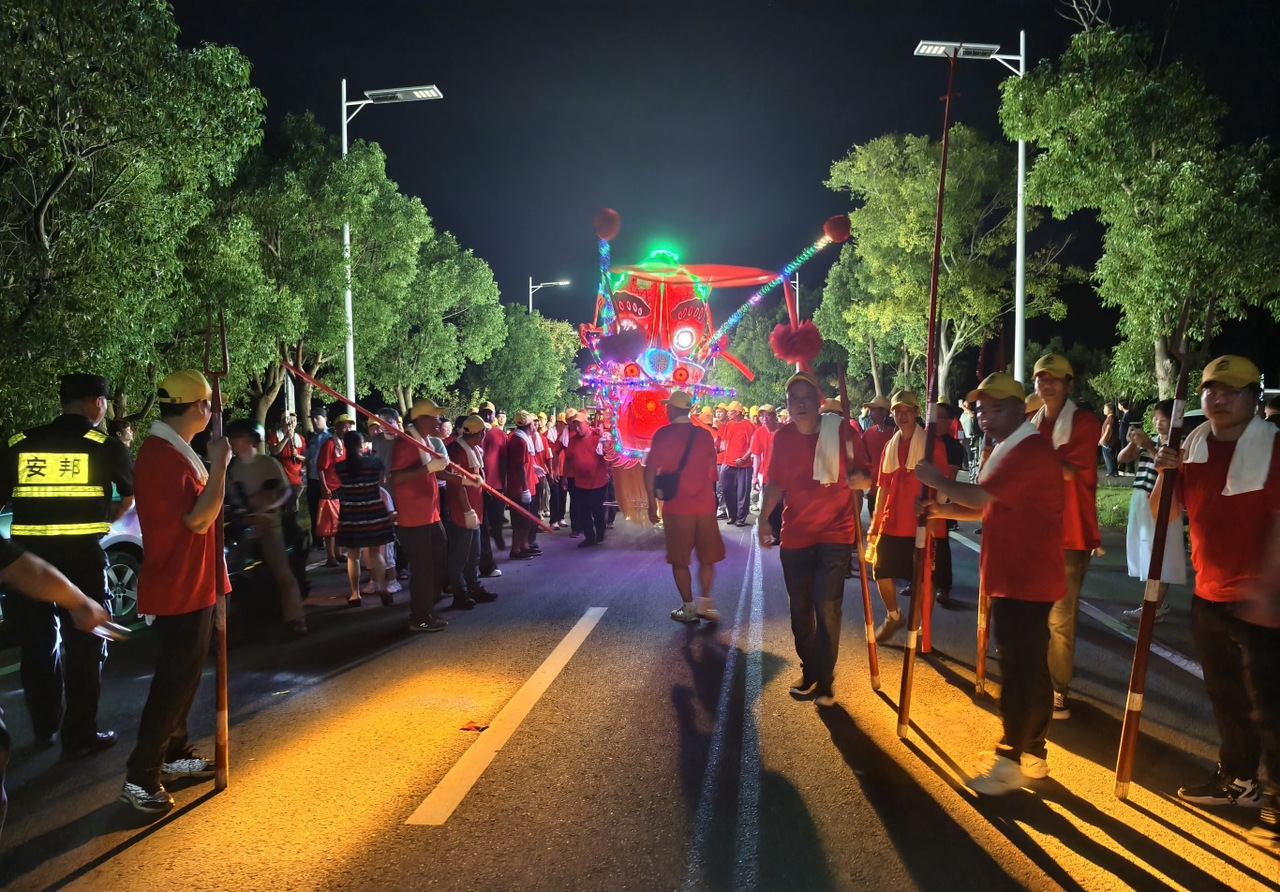 作为整场活动的“重头戏”,杨家板龙巡游从午后持续至夜晚。下午3点左右,这支由1000余人组成、长达300余米的板龙整装待发。随着鼓声响起,巡游队员们手举龙身整齐迈步,带动板龙灵活“游动”,龙首时而高昂、时而低伏,龙尾随之摆动,场面壮观。 “太有感染力了!这种传统代表性非遗巡游比在屏幕上看震撼多了。”早早从温岭赶来的游客彭文琴,用手机记录下这一幕。而巡游队员任传广也坦言:“我们不仅希望让更多人看到杨家板龙巡游的风采,更想把杨家板龙的精神好好传承下去。”