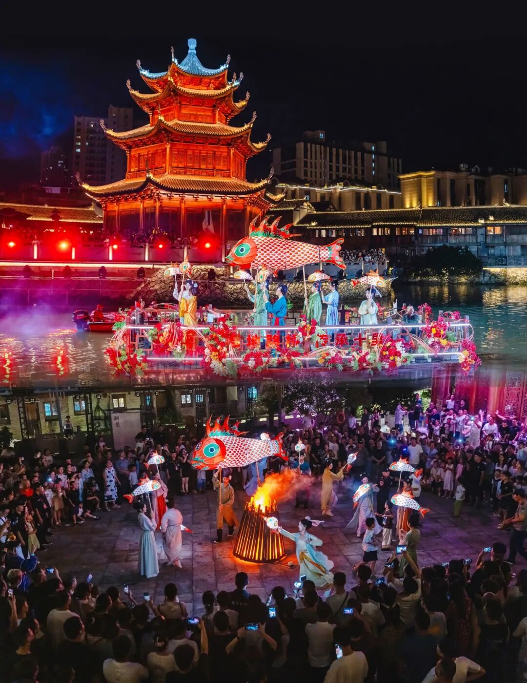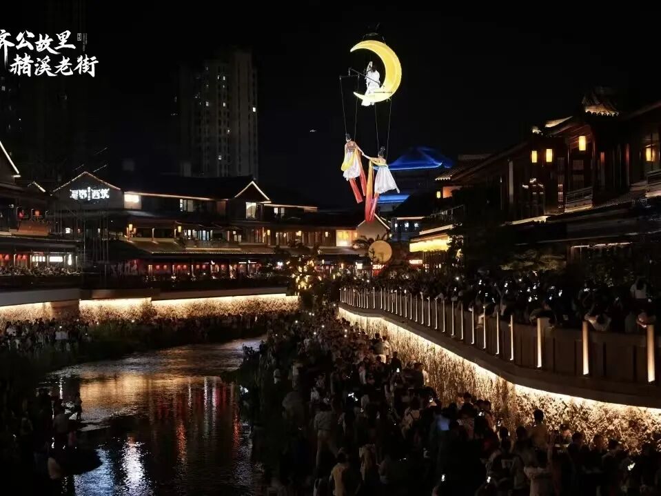 天台赭溪老街重磅推出全国首场“鹊梦赭溪”真人飞天秀2.0版,四大主题轮番上演,每晚四场,场场爆满。